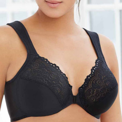 Wonderwire design has a hidden cushioned band. This Elegance Front-Close bra by Glamorise features a flattering lace neckline with an easy-onoff closure. A padded channel surrounds the underwire so all you feel is support.